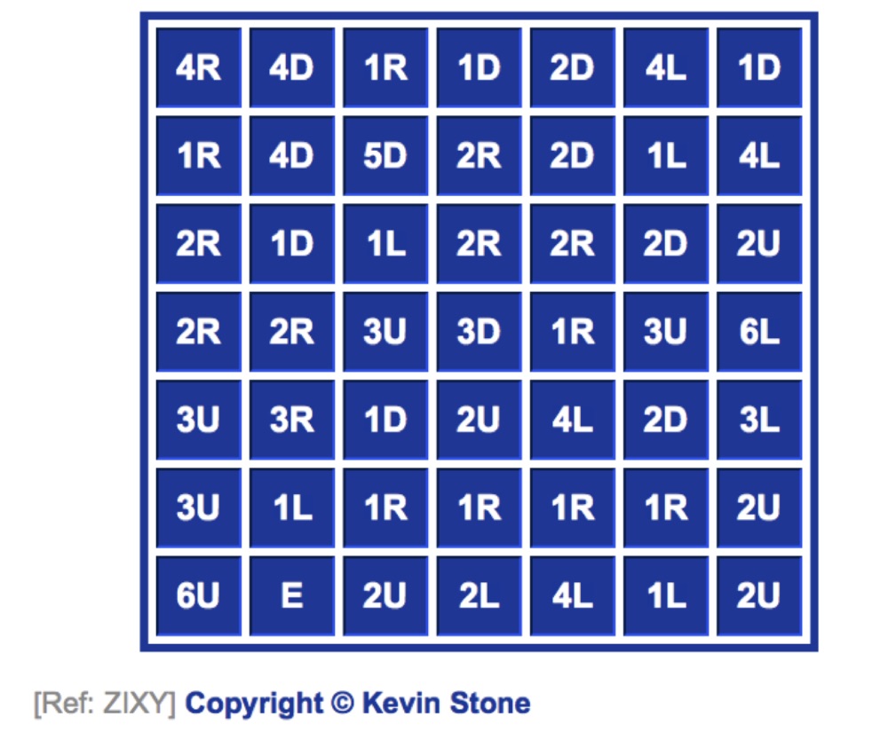 next, for example, 2U means move up 2 buttons and 3R means move right 3